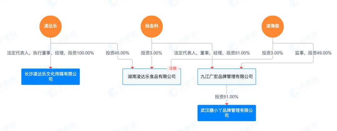 天眼查显示,膳小丫关联公司武汉膳小丫品牌管理有限公司的二级股东凌海俊与凌达乐相关公司关系匪浅。凌海俊曾在已注销的湖南凌达乐食品有限公司担任股东。